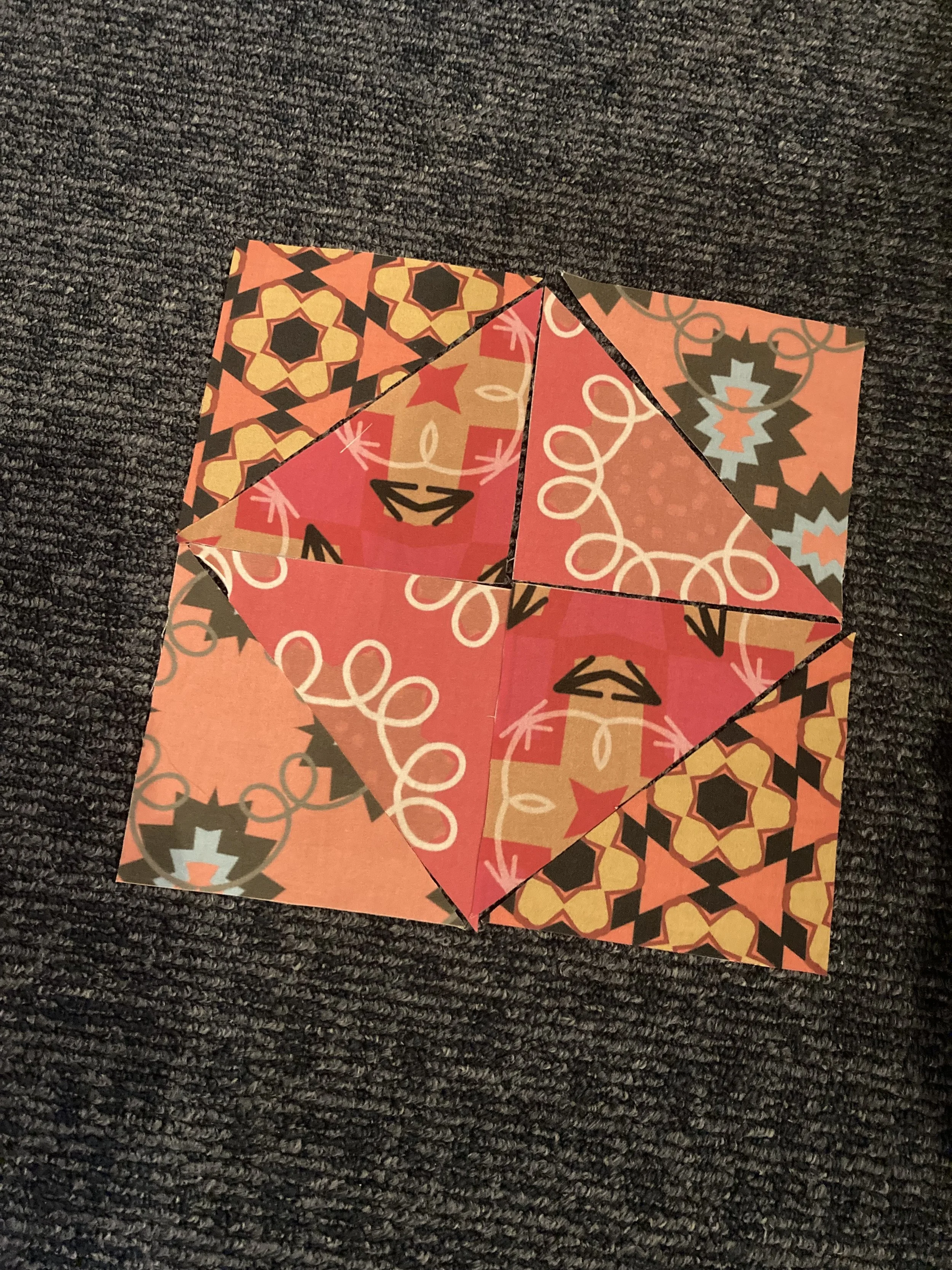 The coral orange and baby blue and late summer yellow abstract geometric floral is part of the Dismal Y2K collection and has to do with how the story feels through my Emmy and Phoebe characters as Y2K era women. The yellow and soft orange fabric in the core of the quilt block is a softer take on the vintage linoleum inside the abandoned house in the first book.